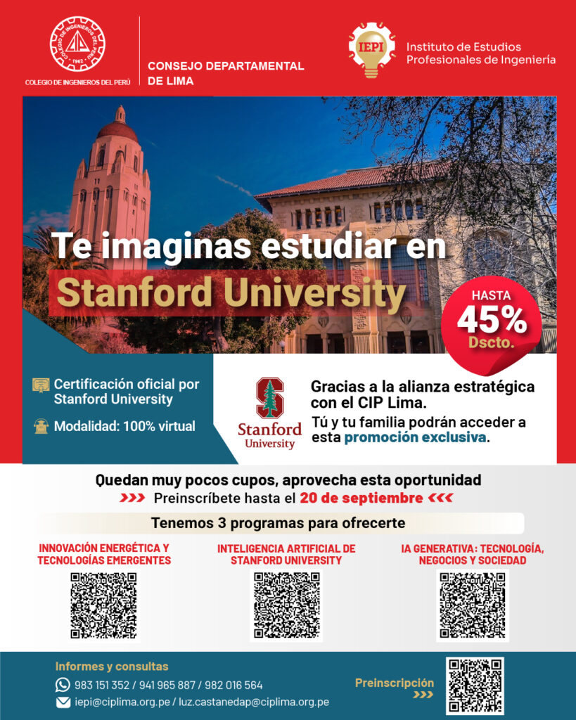 El CIP Lima, en alianza con el Instituto de Educación Profesional Internacional (IEPI), anuncia la apertura de inscripciones para programas internacionales de Stanford University, una oportunidad única para que los ingenieros colegiados y sus familiares accedan a formación de primer nivel con hasta 45% de descuento.