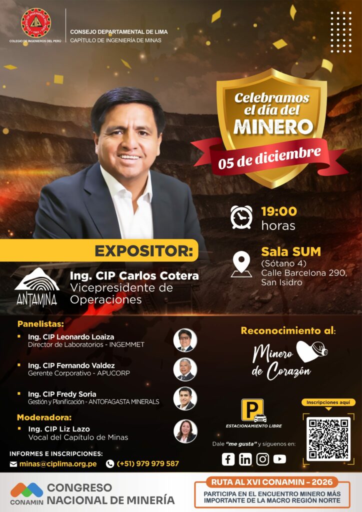 Mañana 05 de diciembre el Capítulo de Ingeniería de Minas – CIP Lima reconoce y rinde homenaje a quienes, con su trabajo y compromiso, impulsan el desarrollo de la industria minera y del país.