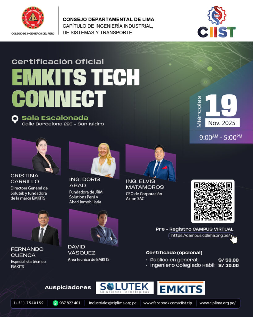 El Capítulo de Ingeniería Industrial, de Sistemas y Transporte te invita a ser parte de la nueva generación de profesionales conectados con la tecnología y la innovación. Obtén la Certificación Oficial EMKITS TECH CONNECT.