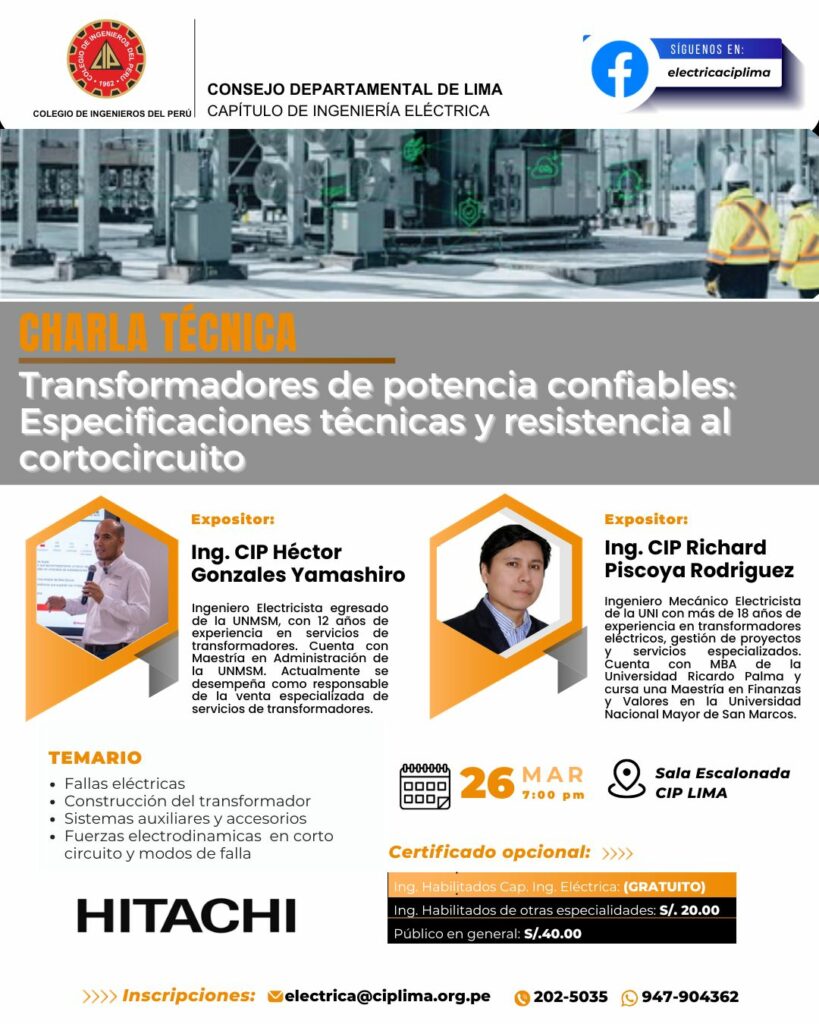 El CIP Lima a través del Capítulo de Ingeniería Eléctrica, organiza la charla técnica “Transformadores de potencia confiables: Especificaciones técnicas y resistencia al cortocircuito”, un espacio orientado a fortalecer conocimientos en uno de los componentes críticos del sistema eléctrico.