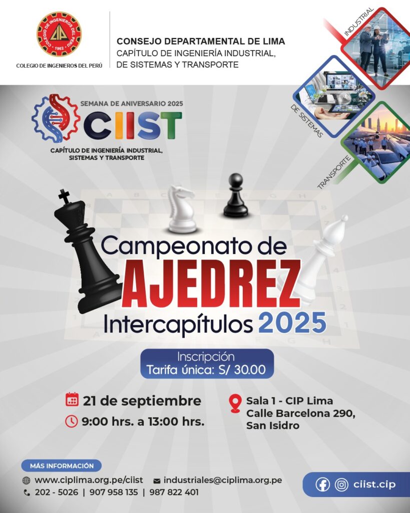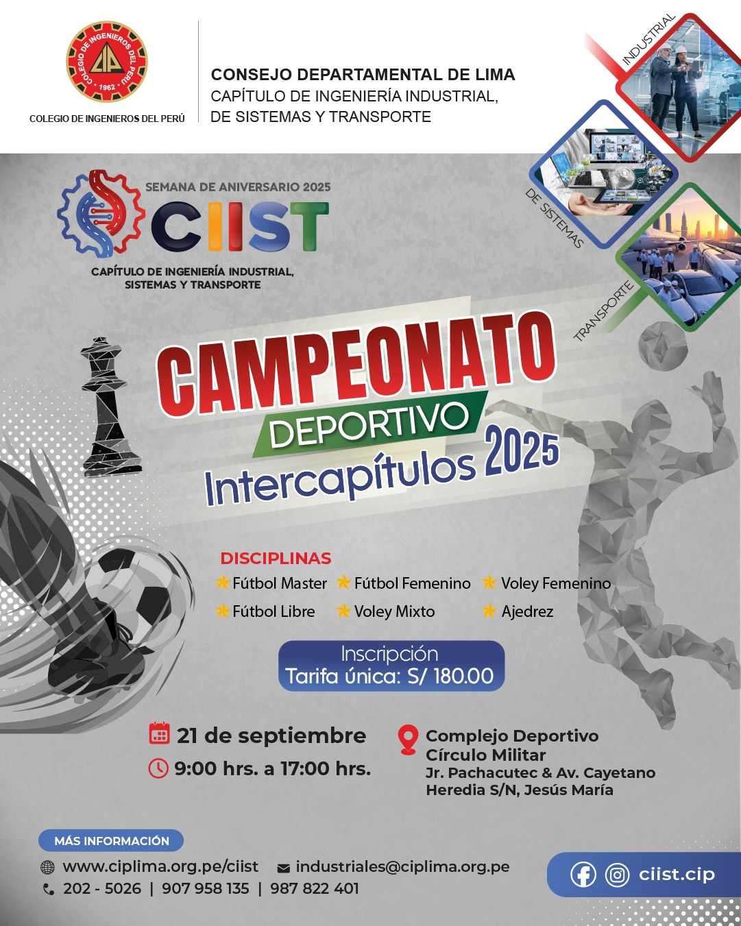 El Consejo Departamental de Lima del Colegio de Ingenieros del Perú (CIP Lima) y el Capítulo de Ingeniería Industrial, de Sistemas y Transportes (CIIST) invitan a la comunidad de ingenieros a participar en el Campeonato de Deportes Inter Capítulos 2025, un encuentro que busca fortalecer los lazos de unión entre colegas y promover el deporte como parte del desarrollo integral de la profesión.
