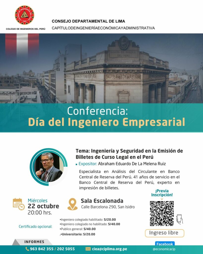 El Capítulo de Ingeniería Económica y Administrativa del CIP Lima, organiza esta conferencia a cargo de Abraham De La Melena, especialista en análisis del Circulante en Banco Central de Reserva del Perú, experto en impresión de billetes. Ingreso libre, previa inscripción.