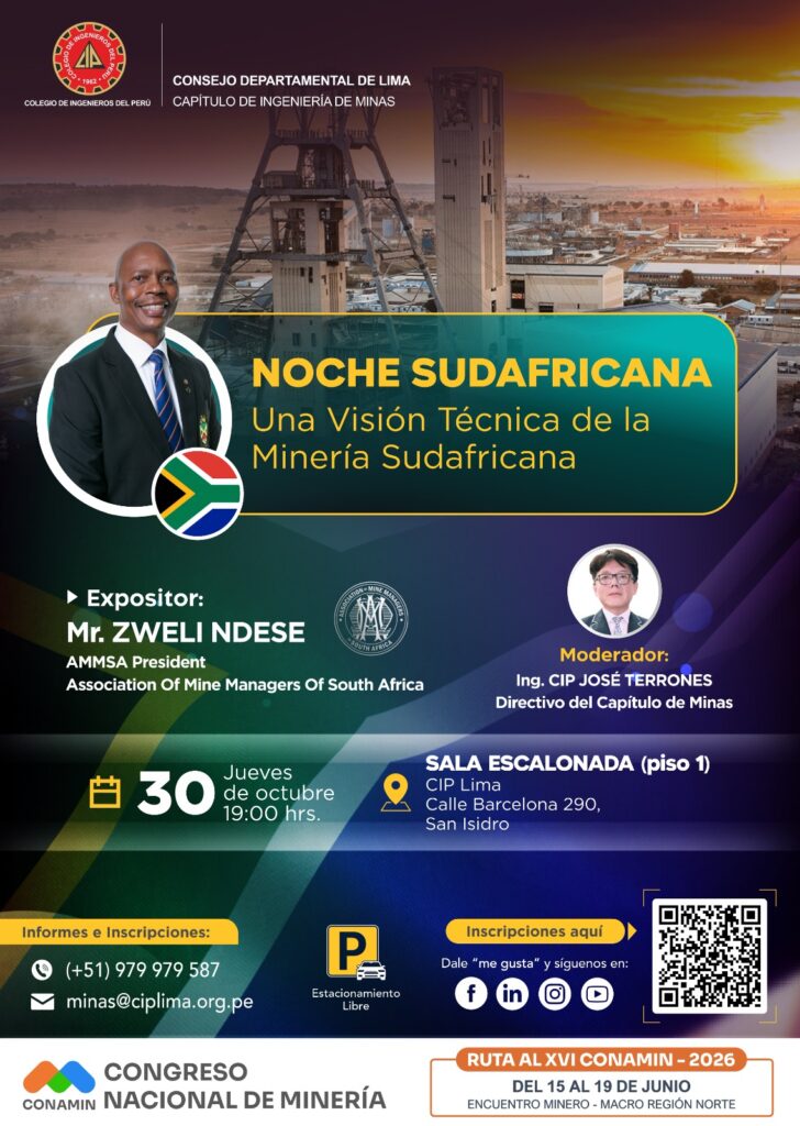 El Consejo Departamental de Lima del Colegio de Ingenieros del Perú, a través del Capítulo de Ingeniería de Minas, presenta esta conferencia internacional que reunirá a destacados profesionales del sector para conocer de cerca las experiencias, avances y desafíos de la minería en Sudáfrica.