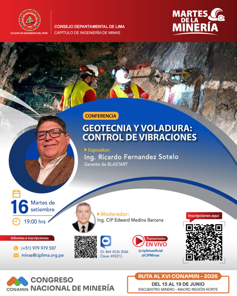 En esta ocasión se presentará la conferencia “Geotecnia y Voladura: Control de Vibraciones”, a cargo del Ing. CIP Ricardo Fernández Sotelo, gerente de BLASTART, profesional con amplia experiencia en el diseño y control de operaciones de voladura. El evento contará con la moderación del Ing. CIP Edward Medina Bárcena.