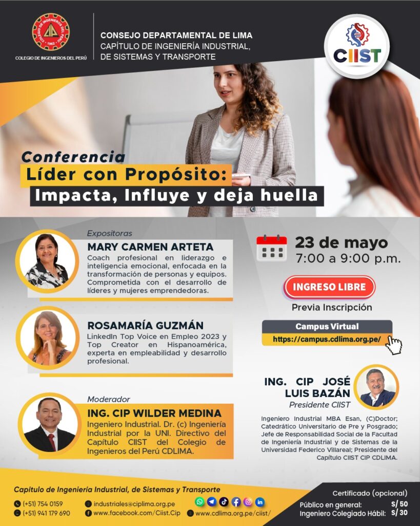 El Capítulo de Ingeniería Industrial, de Sistemas y transporte del CIP Lima te invita a participar de la conferencia «Líder con propósito: Impacta, influye y deja huella». Un evento pensado para profesionales que quieren marcar la diferencia.