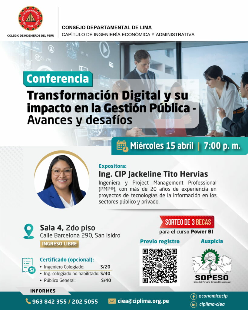 El Consejo Departamental de Lima del Colegio de Ingenieros del Perú, a través del Capítulo de Ingeniería Económica y Administrativa, tiene el honor de invitarlos a esta conferencia presencial.