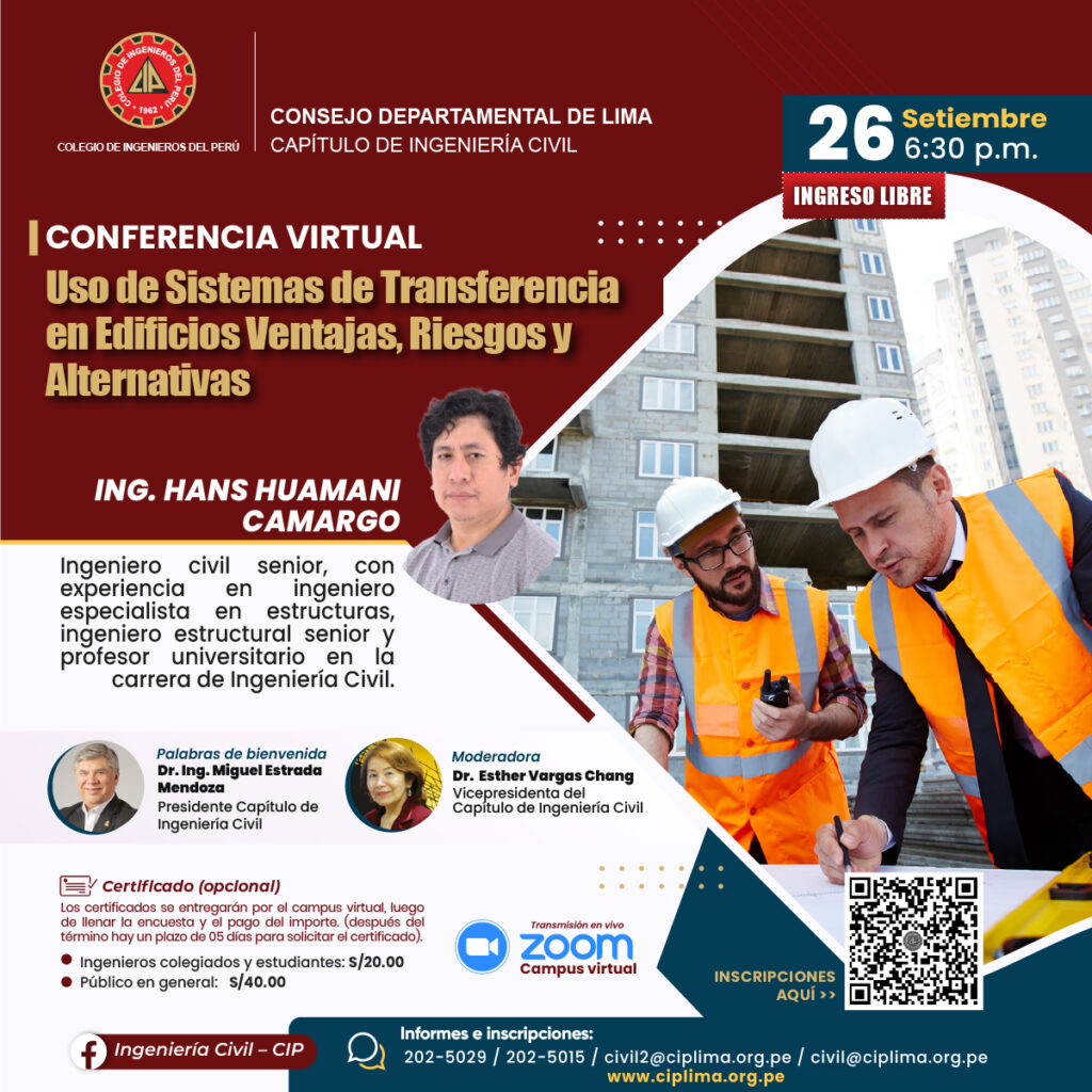 La Junta Directiva del Capítulo de Ingeniería Civil del Consejo Departamental de Lima del Colegio de Ingenieros del Perú (CIP Lima) invita a la comunidad profesional y académica a participar en la conferencia virtual “Uso de Sistemas de Transferencia en Edificios: Ventajas, Riesgos y Alternativas”, que estará a cargo del Ing. Hans Huamani Camargo.