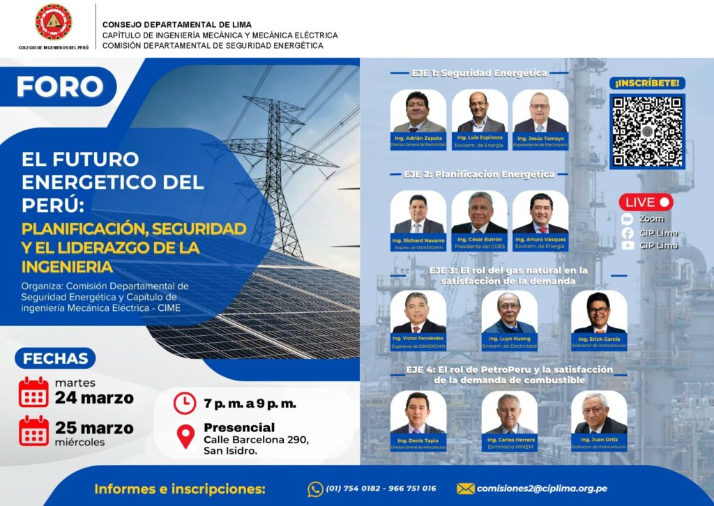 El Consejo Departamental de Lima, a través del Capítulo de Ingeniería Mecánica y Mecánica Eléctrica (CIME) y la Comisión Departamental de Seguridad Energética, desarrollará el foro “El futuro energético del Perú: planificación, seguridad y el liderazgo de la ingeniería”. Este espacio técnico de alto nivel, orientado a analizar soluciones concretas para el país, se llevará a cabo los días 24 y 25 de marzo, en nuestra sede institucional. (Inscríbete: https://campus.ciplima.org.pe/programa-de-capacitacion/1052)