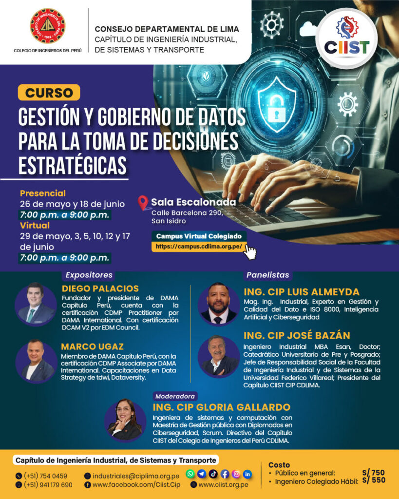 El Capítulo de Ingeniería Industrial, de Sistemas y Transporte del CIP Lima te invita a participar en el Curso: «Gestión y Gobierno de Datos para la Toma de Decisiones Estratégicas».