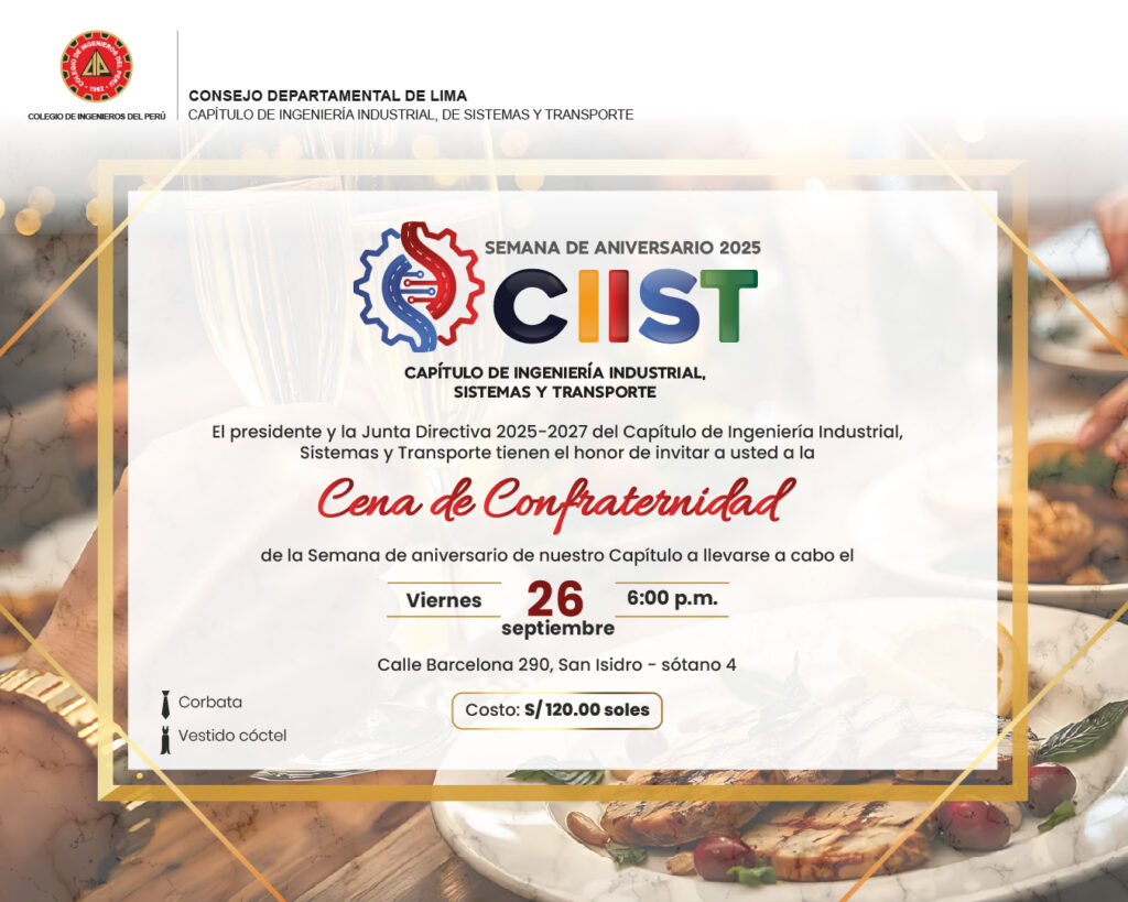 El Capítulo de Ingeniería Industrial, de Sistemas y Transportes – CIP Lima, en el marco de la celebración de nuestro 63° Aniversario, tenemos el honor de invitar a todos los ingenieros colegiados y habilitados a participar en nuestra Cena de Gala de Confraternidad, un espacio para compartir, reencontrarnos y celebrar los logros que hemos construido juntos como Capítulo.