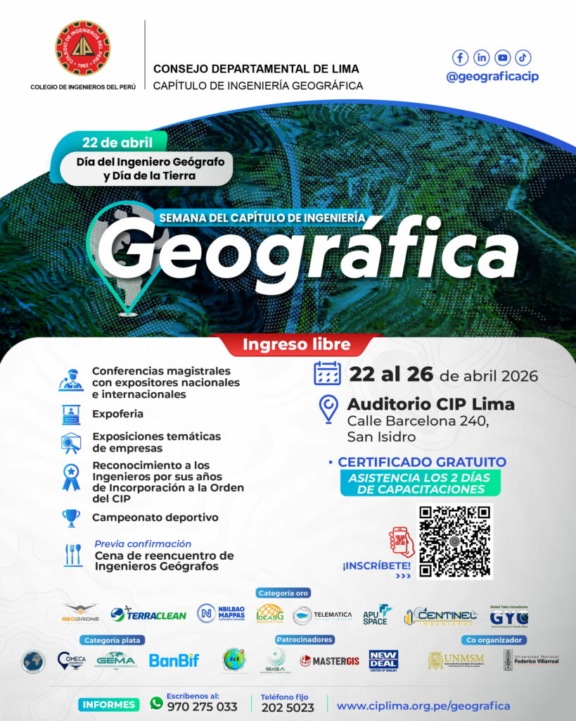 El Capítulo de Ingeniería Geográfica del CIP Lima celebra su semana institucional. Durante cuatro días viviremos conferencias magistrales con expositores nacionales e internacionales, exposiciones temáticas de empresas y una expoferia especializada.