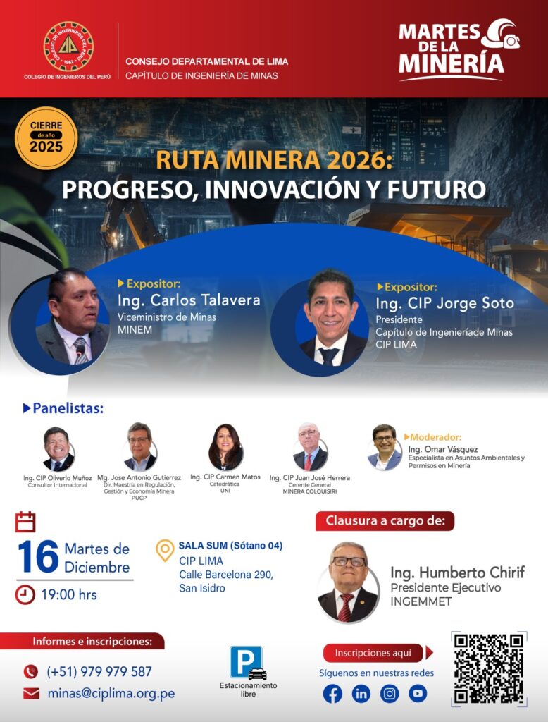 El Capítulo de Ingeniería de Minas del Consejo Departamental de Lima del Colegio de Ingenieros del Perú anuncia su ultima conferencia de cierre de año 2025, a cargo de los ingenieros Carlos Talavera, viceministro de minas y Jorge Soto, presidente del Capítulo de Ingeniería de Minas del CIP Lima.