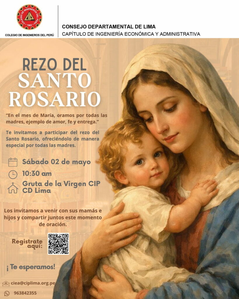 En el marco del mes de María, el CIP Lima, a través del Capítulo de Ingeniería Económica y Administrativa, los invita a sus miembros y al público en general a participar en el Rezo del Santo Rosario, una actividad espiritual dedicada de manera especial a todas las madres.