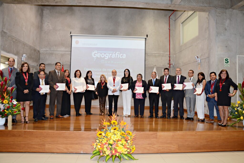 En este marco, también se confirió un reconocimiento al Dr. César Augusto Muñoz Ortega, decano de la Facultad de Ingeniería Geográfica, Ambiental y Ecoturismo de la Universidad Nacional Federico Villarreal (UNFV); así como un reconocimiento póstumo al Dr. Jorge Lescano Sandoval, por su destacada labor y contribución al desarrollo de la Escuela Profesional de Ingeniería Geográfica de la UNFV.