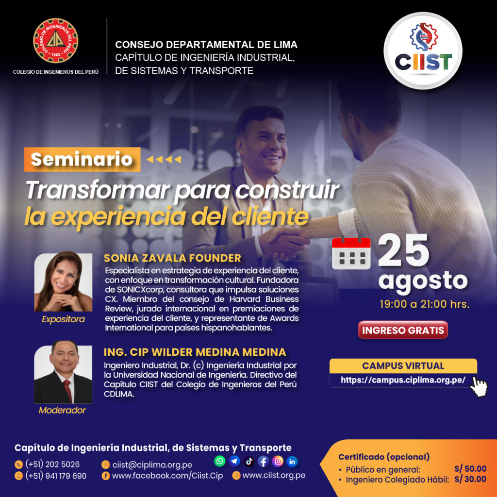 El CIP Lima, a través de su Capítulo de Ingeniería Industrial, anuncia la realización del seminario virtual “Transformar para Construir la Experiencia del Cliente”, el cual se llevará través de su Campus Virtual. ¡Cupos limitados!