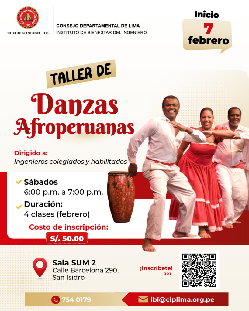 El Instituto de Bienestar del Ingeniero del Consejo Departamental de Lima – CIP presenta su Taller de Danzas Afroperuanas, un espacio para aprender, expresarte y celebrar nuestras raíces afroperuanas al ritmo del cajón y el zapateo.