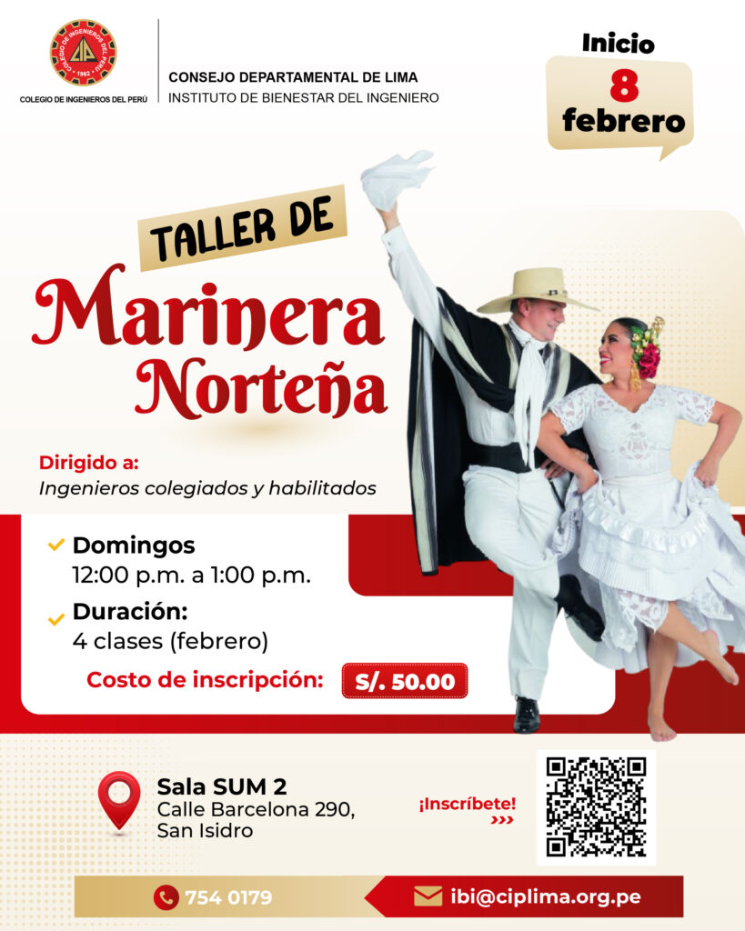 El Instituto de Bienestar del Ingeniero del Consejo Departamental de Lima – CIP presenta su Taller de Marinera Norteña, dirigido a ingenieros colegiados y habilitados.