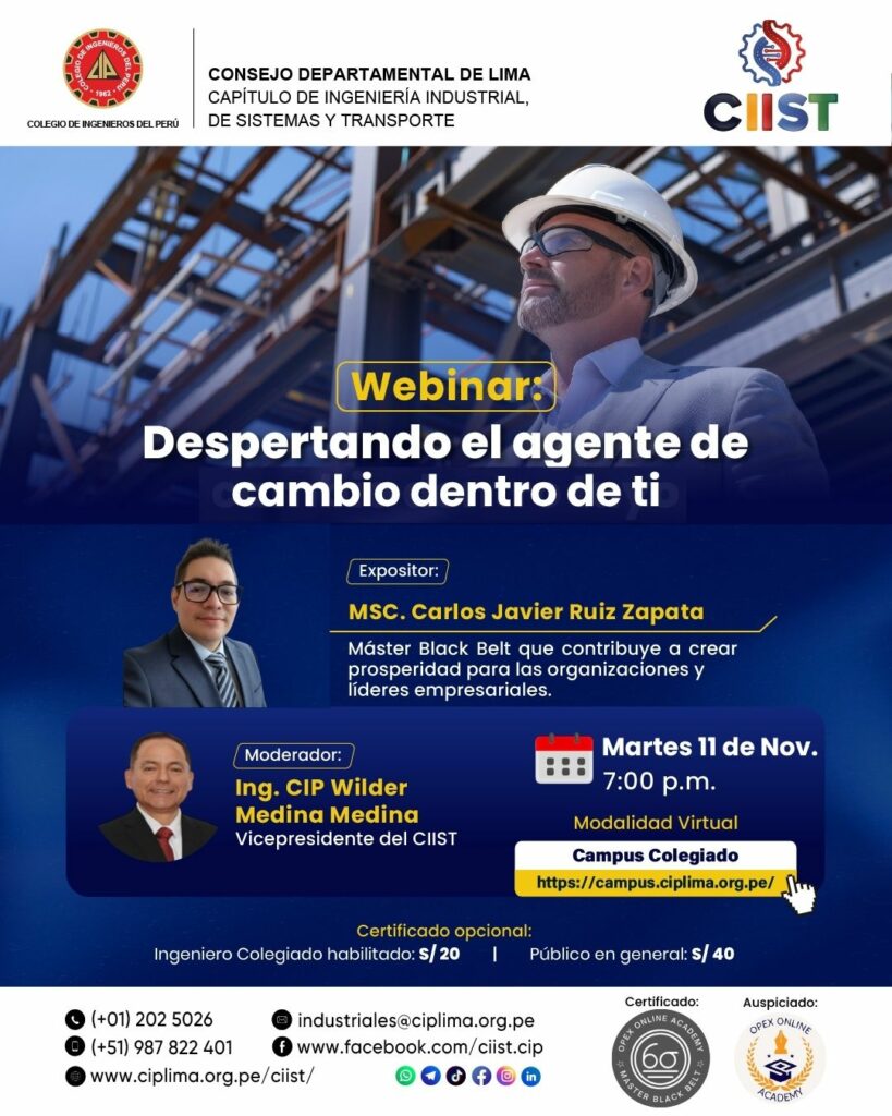 El Capítulo de Ingeniería Industrial, de sistemas y transporte del CIP Lima, organiza este webinar a cargo del MSC. Carlos Javier Ruiz Zapata, máster Black Belt que contribuye a crear prosperidad para los organizaciones y líderes empresariales. Acceso libre, previa inscripción.