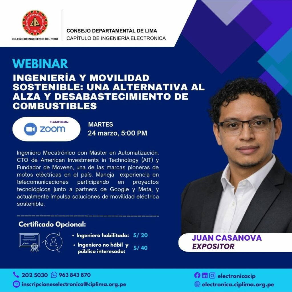 El Capítulo de Ingeniería Electrónica, organiza el webinar “Ingeniería y movilidad sostenible: una alternativa al alza y desabastecimiento de combustibles”, un espacio orientado a abordar los desafíos actuales del sector energético desde la innovación tecnológica.