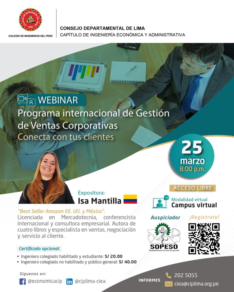 El Capítulo de Ingeniería Económica y Administrativa del CIP Lima organiza este webinar internacional con el objetivo de fortalecer las competencias en gestión estratégica de ventas, orientadas a la conexión efectiva con clientes y al desarrollo de relaciones comerciales sostenibles.